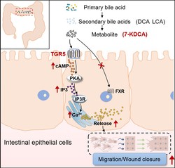Recently, Professor Dai Yues team from the School of Traditional Chinese Medicine published their latest research findings in the top-tier journal Advanced Science, titled “7-Ketodeoxycholic Acid Promotes Colonic Mucosal Healing by Inducing Calcium Release from Endoplasmic Reticulum via the TGR5-IP3R Pathway.” This study explores the pivotal role of bile acid metabolites in intestinal mucosal repair, offering novel insights for treating ulcerative colitis (UC).Impaired mucosal healing is a core