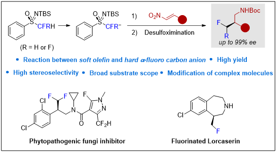 The selective introduction of fluorine atoms or fluoroalkyl groups can significantly alter the physical and biological properties of organic molecules. γ-Fluoroamines have been demonstrated to play crucial roles in treating various diseases as TRPC6 channel inhibitors, CDK11 inhibitors, plant pathogenic fungal inhibitors, and cysteine protease inhibitors. However, existing methods are highly limited in applicability and typically require multi-step synthesis. Furthermore, low enantiomeric excess (ee) values persist, and efficient, highly stereoselective, and convenient approaches remain elusive. Consequently, there is an urgent need to develop a novel, efficient, and straightforward strategy for synthesizing optically pure beta-difluoromethylamine derivatives.