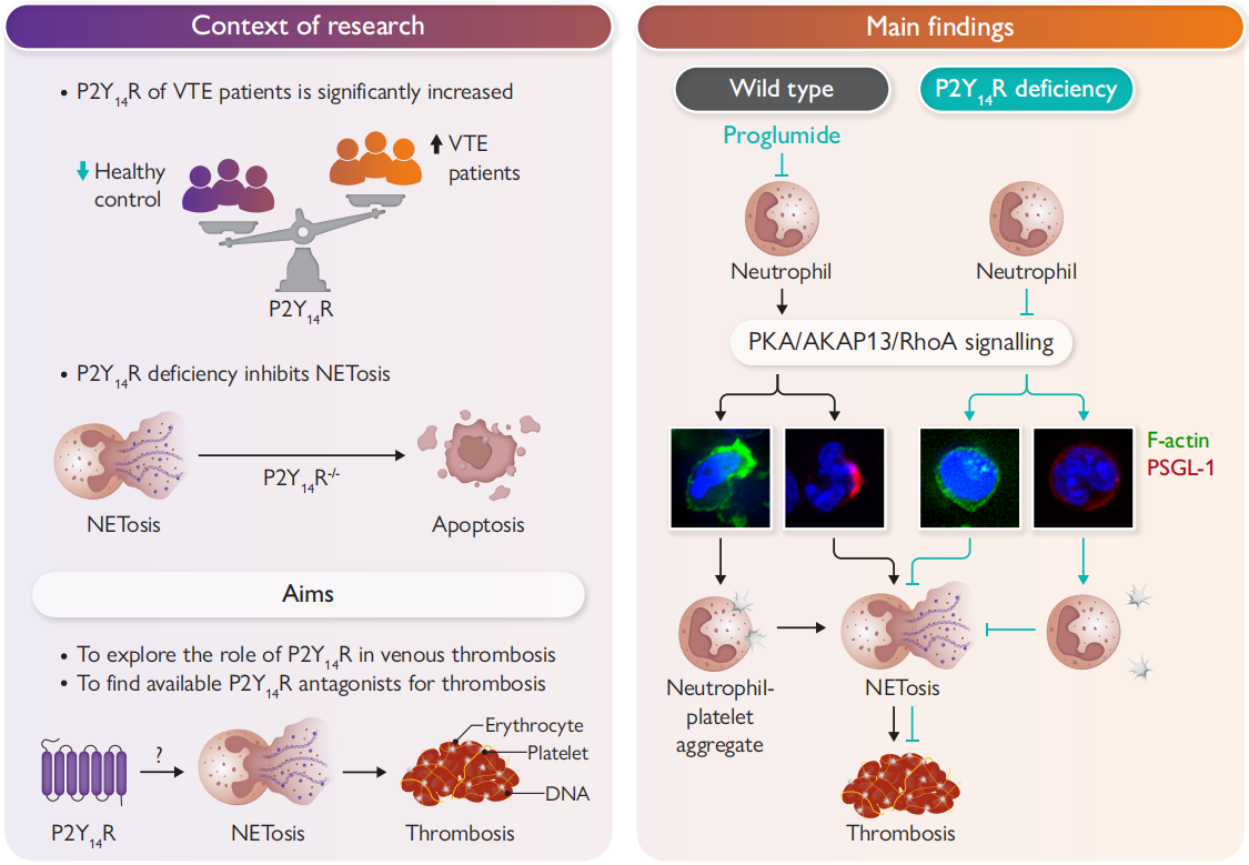 NETs play a crucial role in thrombosis, yet their regulatory mechanisms remain incompletely understood, and specific intervention strategies are currently lacking. Notably, prior studies suggested that inhibiting P2Y14R to limit neutrophil chemotaxis and excessive activation may benefit inflammatory thrombosis associated with infectious diseases like COVID-19. Against this backdrop, this study revealed significantly elevated P2Y14R expression in neutrophils from VTE patients. Using multiple knockout mouse models, the research team demonstrated that neutrophil-specific P2Y14R deficiency significantly suppressed NET release, alleviated venous thrombosis, and reduced inflammatory responses. Mechanistic studies revealed that P2Y14R deficiency activates PKA, promotes AKAP13 phosphorylation, inhibits RhoA activity and cytoskeletal reorganization, ultimately reducing neutrophil-platelet aggregation and NET formation. Further investigations revealed that the marketed drug clopidogrel is a high-affinity P2Y14R inhibitor (IC50 = 34.27 nM). In vivo and in vitro experiments confirmed that clopidogrel effectively inhibits NET release and alleviates thrombosis without increasing bleeding risk or impairing normal platelet aggregation, demonstrating promising drugability and safety. This study not only elucidates a novel mechanism of P2Y14R in VTE but also provides theoretical basis and candidate molecules for developing novel drugs with dual anti-inflammatory and anti-thrombotic effects (see figure below).