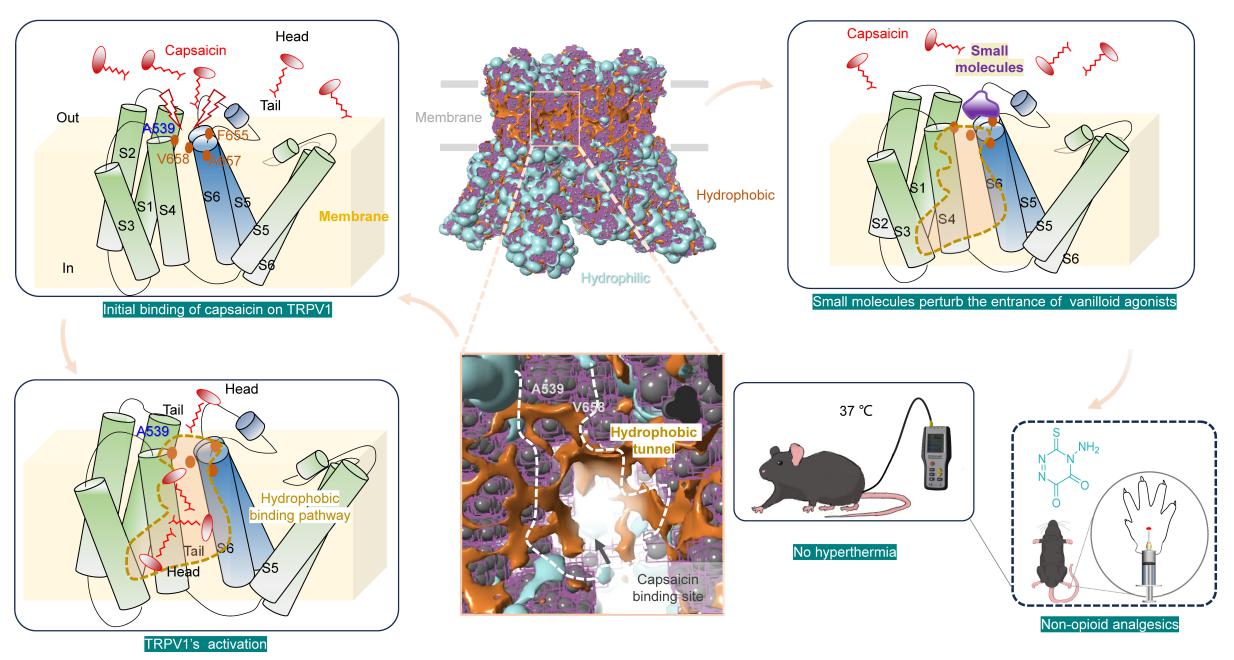 Employing multidimensional techniques including free energy potential surface reconstruction, metadynamics simulations, fluorescence voltage clamp (VCF), patch-clamp recording, single-particle cryo-EM imaging, and animal behavioral experiments, the study identified a hydrophobic pathway formed between the TRPV1 protein and the cell membrane as the primary route for vanilloid ligands (such as capsaicin) to access the channel's binding site. Modulating the amino acid composition of this pathway or molecularly blocking this entry point can selectively delay agonist entry and optimize channel response, thereby achieving precise analgesia while avoiding thermoregulatory disruption.
